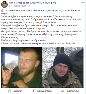 "С 4 апреля Дениса Кравченко, спецназовца с третьего полка спецназначения, искали. Собратья, полиция. Обследовали сотни подвалов, чердаков, теплосетей и лесополос. Надежды больше нет. Сегодня тело Дениса было найдено в Ингуле", - говорится в заметке.