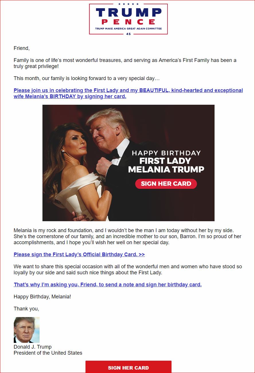 Президент США призвал получателей этого сообщения присоединиться к поздравлениям первой леди и подписать для нее открытку.