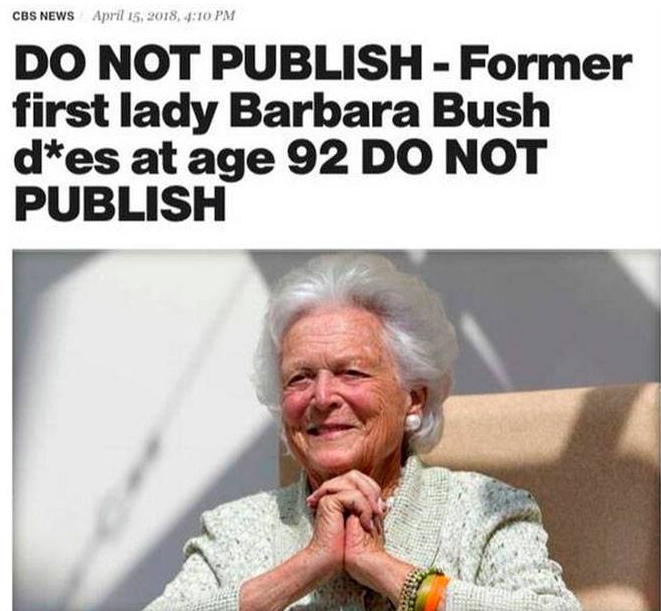 Новостная служба американского телеканала CBS ошибочно разместила на сайте некролог о жене экс-президента США Джорджа Буша-старшего Барбаре, которая сейчас находится в госпитале.