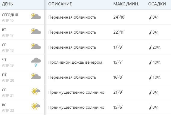 11 апреля, среда             +24, переменная облачность