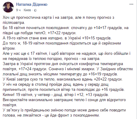 "Киевляне! 19 апреля, в четверг - дожди, ветер и +12, +13 градусов", - добавила синоптик.