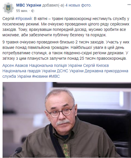 "9 мая ожидаем проведение около 2 тысяч мероприятий. Участие в них примет более полумиллиона граждан. Наибольшего внимания в это день потребует столица, а также юго-восточные регионы страны. В связи с этим планируется привлечь более 25 тысяч правоохранителей", - говорится в сообщении в соцсети.