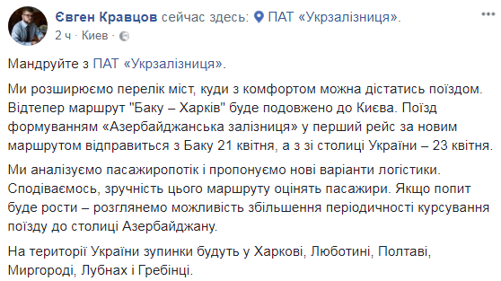 "Маршрут "Баку - Харьков" будет продлен до Киева. Поезд в первый рейс по новому маршруту отправится из Баку 21 апреля, а из столицы Украины - 23 апреля. На территории Украины остановки будут в Харькове, Люботине, Полтаве, Миргороде, Лубнах и Гребенке", – сообщил глава "Укрзализныци".