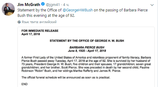 Напомним, что ранее новостная служба американского телеканала CBS ошибочно разместила на сайте некролог о жене экс-президента США Джорджа Буша-старшего Барбаре еще 16 апреля. В заголовке статьи содержалась пометка "Не публиковать". Текст был размещен на сайте на некоторое время, затем его сняли.