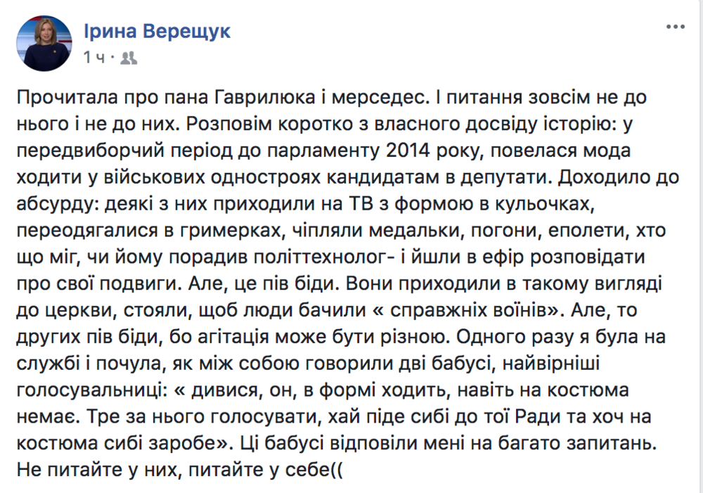 "Прочитала о господине Гаврилюке и мерседесе. И вопрос вовсе не к нему и не к ним. Расскажу коротко по собственному опыту историю: в предвыборный период в парламент 2014 года, пришла мода ходить в военной форме кандидатам в депутаты. Доходило до абсурда: некоторые из них приходили на ТВ форме в кулечках, переодевались в гримерных, цепляли медальки, погоны, эполеты, кто что мог, или ему посоветовал политтехнолог - и шли в эфир рассказывать о своих подвигах.