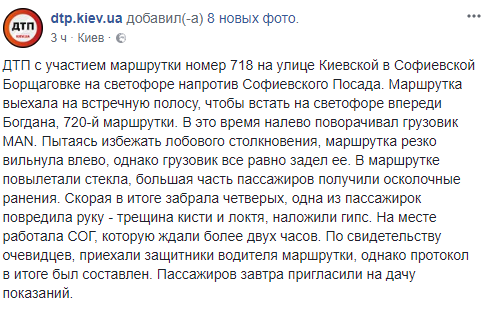 Как сообщает ДТП.kiev.ua на своей странице в Facebook, маршрутка с пассажирами столкнулась с грузовиком. В результате инцидента в больницу попали четыре человека.