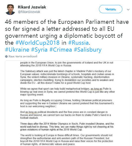 В Европарламенте 46 депутатов призвали руководства стран-членов ЕС бойкотировать Чемпионат мира-2018 по футболу в России.