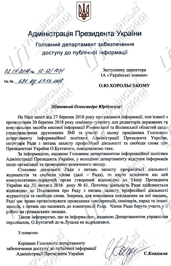При этом, в ответе уточнили, что Совет по свободе слова при президенте Украины согласно положению об этом органе действительно может организовывать конференции, семинары и другие мероприятия, но члены этого Совета осуществляют деятельность исключительно "на общественных началах". А в  Департаменте управления персоналом АП сообщили, что Александр Бухтатый в командировку в Луцк не отправлялся.