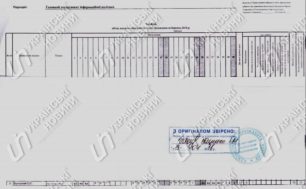Українські Новини снова обратились в АП с просьбой уточнить, где именно 30 марта находился их сотрудник? И получили копию табеля учета рабочего времени. Согласно этому документу, в день проведения семинара в Луцке Александр Бухтатый взял в АП однодневный отпуск, а потому не мог официально представлять на мероприятии позицию АП.