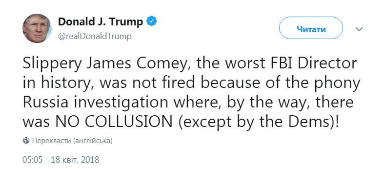 "Слизняк Джеймс Коми, худший глава ФБР в истории, был уволен не из-за расследования о России, где, кстати, не было никакого сговора (кроме демократов)", - написал Трамп в твиттере.