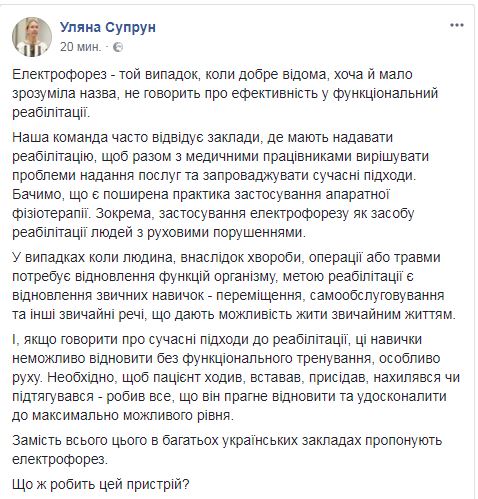 Она добавляет, что "вместо всего этого во многих украинских заведениях предлагают электрофорез".