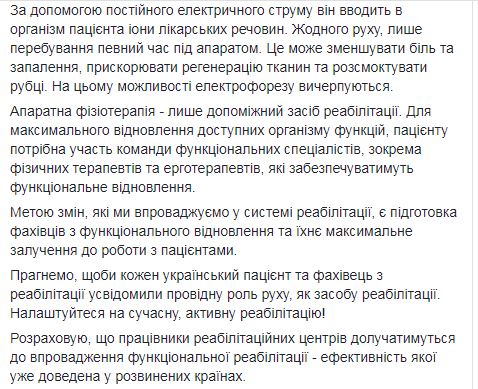"Аппаратная физиотерапия - лишь вспомогательное средство реабилитации. Для максимального восстановления доступных функций организма, пациенту требуется участие команды функциональных специалистов, в частности физических терапевтов и эрготерапевтов, которые будут обеспечивать функциональное восстановление, - отмечает Супрун.