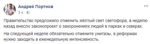 Экс-глава АП Андрей Портнов высмеял инициативу Кабмина: "Правительство предложило отменить желтый свет светофора, а неделю назад внесло законопроект о захоронениях людей в парках и скверах.