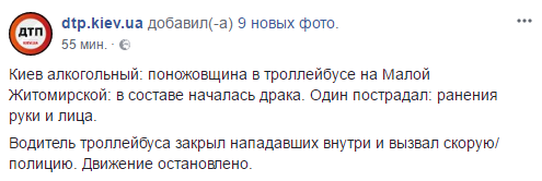 "Поножовщина в троллейбусе на Малой Житомирской: в составе началась драка. Один пострадал: ранения руки и лица. Водитель троллейбуса закрыл нападавших внутри и вызвал скорую/полицию. Движение остановлено", – говорится в сообщении.