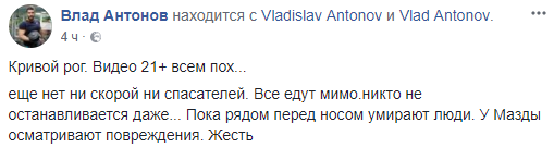 "Пока рядом перед носом умирают люди. У Мазды осматривают повреждения. Жесть", - написал он и предупредил, что видео 21+.