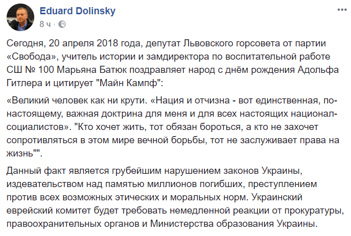 Представитель ВО Свобода Марьяна Батюк опубликовала у себя в Facebook "няшную" фотографию фюрера, назвала его "большим человеком" и привела две цитаты из "нацистской библии" Mein Kampf ("Моя борьба").