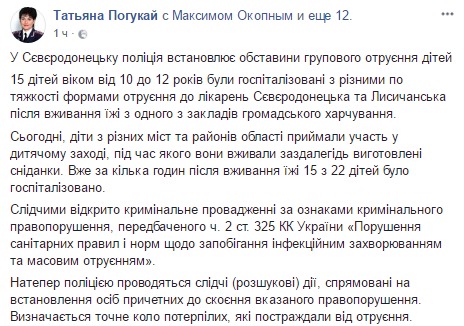 "Сегодня, дети из разных городов и районов области приняли участие в детском мероприятии, во время которого они употребляли заранее приготовленные завтраки. Уже через несколько часов после еды 15 из 22 детей были госпитализированы", - написала  начальник отдела по связям с общественностью Главного управления Национальной полиции Украины в Луганской области Татьяна Погукай на своей странице в соцсети Facebook в пятницу.