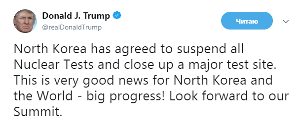 "Северная Корея согласилась приостановить все ядерные испытания и закрыть крупный испытательный полигон. Это очень хорошая новость для Северной Кореи и мира-большой прогресс! С нетерпением ждем встречи на высшем уровне", - написал Трамп.