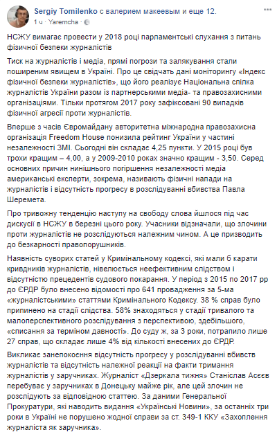 Также в НСЖУ отметили, что вызывает беспокойство отсутствие прогресса в расследовании убийств журналистов и отсутствие надлежащей реакции на факты содержания журналистов в заложниках. Так, журналист "Зеркала недели" Станислав Асеев находится в заложниках в Донецке почти год, но это преступление не расследуется по соответствующей статье.