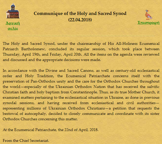 "Священный и Священный Синод под председательством Его Всепосвятительного Вселенского Патриарха Варфоломея завершил свое очередное заседание, которое состоялось в четверг, 19 апреля, и в пятницу, 20 апреля. Все пункты повестки дня были рассмотрены и обсуждены, и были приняты соответствующие решения", – говорится в сообщении от 22 апреля.