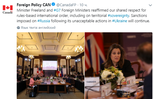 "Министр Фриланд и другие главы МИД стран G7 подтвердили общее стремление порядка, основанного на нормах международного права, в том числе по вопросу территориальной целостности. Санкции, наложенные на Россию после ее неприемлемых действий в Украине, будут продолжаться ", - говорится в сообщении.
