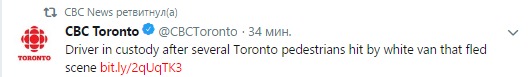 "Полиция Торонто сообщила корреспонденту CBC Натали Калата, что водитель микроавтобуса, который наехал на пешеходов на Йонг-стрит и Финч-авеню, найден и задержан", - сообщается в Twitter телеканала.