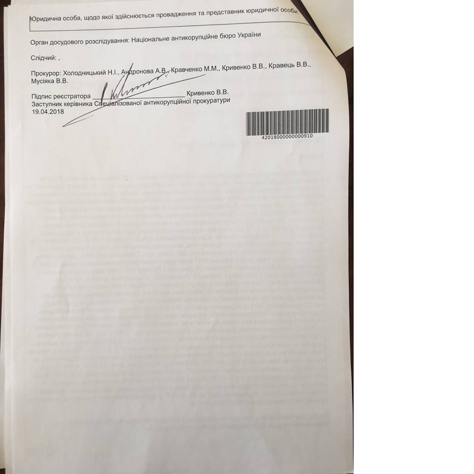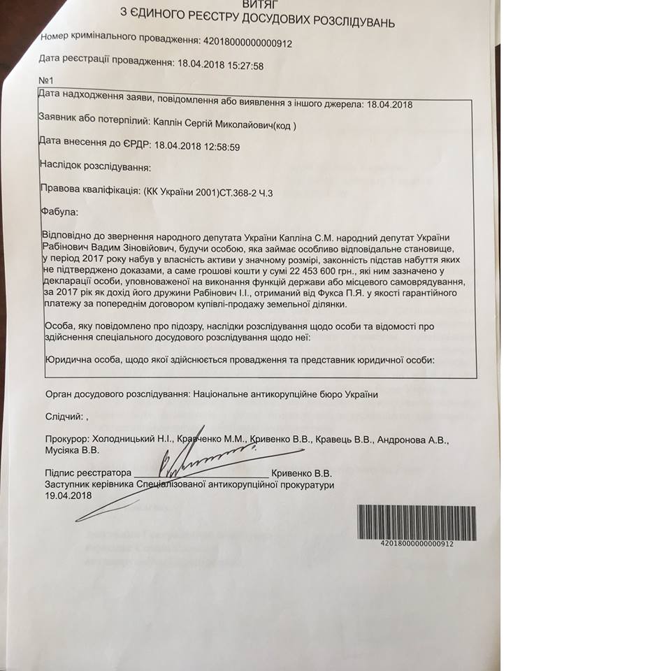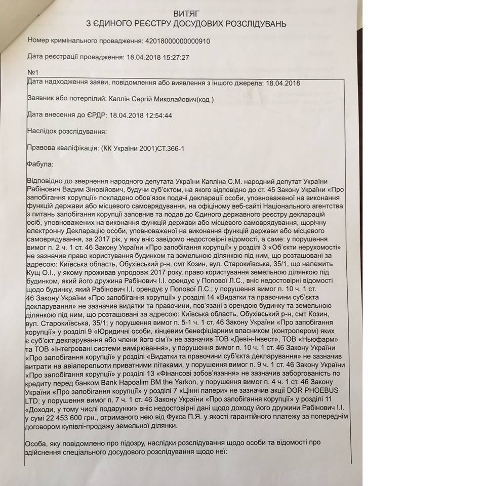 "18 апреля 2018 по моему заявлению открыты два новых уголовных производства по фактам незаконного обогащения и коррупции Давида-Вадима Рабиновича.