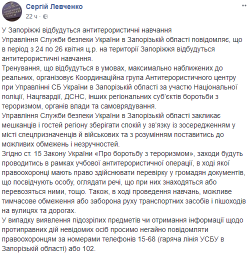 В Запорожье 24-26 апреля пройдут антитеррористические учения, во время которых правоохранители имеют право проводить проверку документов и осматривать вещи граждан, запрещать движения автотранспорта. Об этом на своей странице в Facebook сообщил пресс-секретарь управления СБУ в Запорожской области Сергей Левченко.