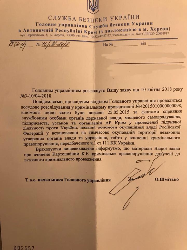 В результате, как следует из писем ведомств, размещенных Портновым, СБУ приобщила его информацию  к уже существующему делу, а прокуратура АР Крым внесла новое уголовное производство, которое касается Картошкина, в единый реестр досудебных расследований.