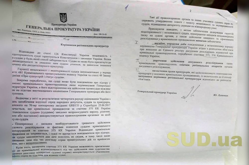 "В ответе по результатам четвертого раунда оценивания Украины по вопросам предотвращения коррупции среди народных депутатов, судей и прокуроров от 26.03.2017 г., уголовные производства по ст. 375 УК используются правоохранительными органами как способ давления на судей", — констатируется в письме Юрия Луценко.