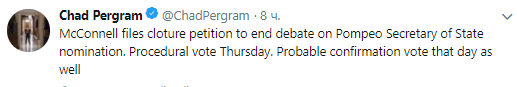 По его словам, председатель республиканского большинства в Сенате Митч Макконел подает ходатайство о прекращении дебатов по номинации Помпео на должность государственного секретаря.