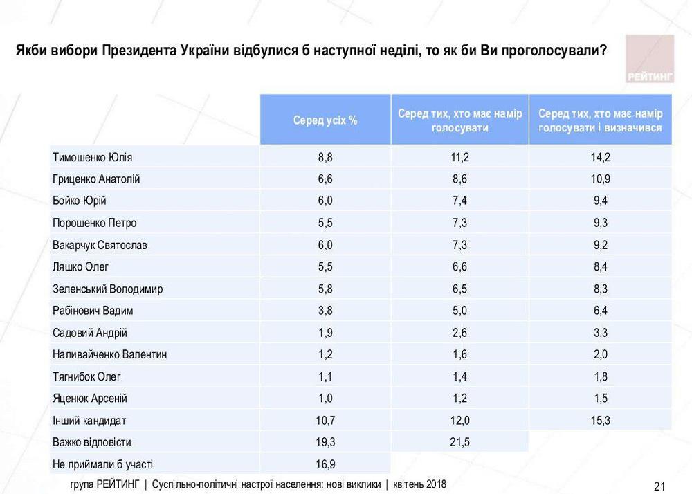При этом за лидера партии "Оппозиционный блок" Юрия Бойко и музыканта Святослава Вакарчука проголосовали бы по 6% опрошенных, за шоумэна Владимира Зеленского – 5,8%, а за действующего главу государства Петра Порошенко и лидера Радикальной партии – по 5,5% респондентов.