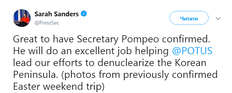 "Замечательно, что госсекретарь Помпео утвержден в должности. Его отличная работа поможет президенту (Дональду Трампу - Прим.Ред.) в его усилиях по денуклеаризации Корейского полуострова", - написала Сандерс, отметив, что две фотографии были сделаны во время поездки Помпео в Пхеньян в первые выходные апреля.