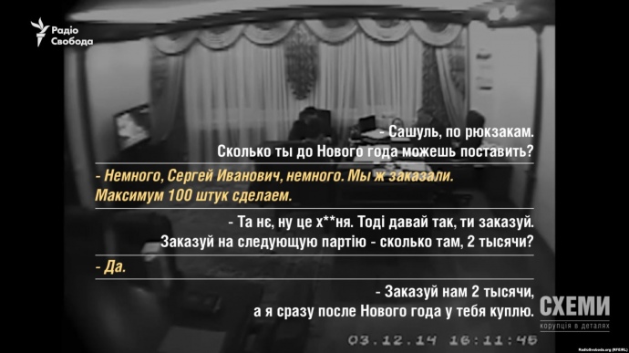 В программе отмечается, что на это устройство были записаны разговоры не только о хищении песка, но и в том числе, о закупке рюкзаков в обход законной тендерной процедуры с участием сына Авакова.