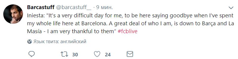 Полузащитник "Барселоны" Андрес Иньеста официально объявил, что уходит из команды по окончании сезона. Об этом сообщает издание Barca Stuff в Twitter.