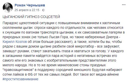 Вот что пишет глава пресс-службы "Национального корпуса" Роман Чернышев: "Парадокс щекотливой ситуации с повышенным вниманием к хаотичным скоплениям цыган: спроси каждого по отдельности, как человек относится к снующим по вагонам транспорта цыганам, к их самозахватным лагерям в природных зонах (не только Лысая гора, но также набережные Днепра), а также хотели бы вы, чтобы рядом с вашим домом цыгане разбили свой микротабор, – все зафукают, замашут руками, станут закатывать глаза и хвататься за голову. У каждого в загашнике памяти найдется пара историй о негативных встречах его самого или его знакомых с изобретательными представителями этого милого народа. Но в то же время маниловские стоны праздных "правозащитников" в поддержку сородичей киношного Будулая набирают сотни лайков в ФБ от тех же самых людей. Вот такое вот медиа-айнене".