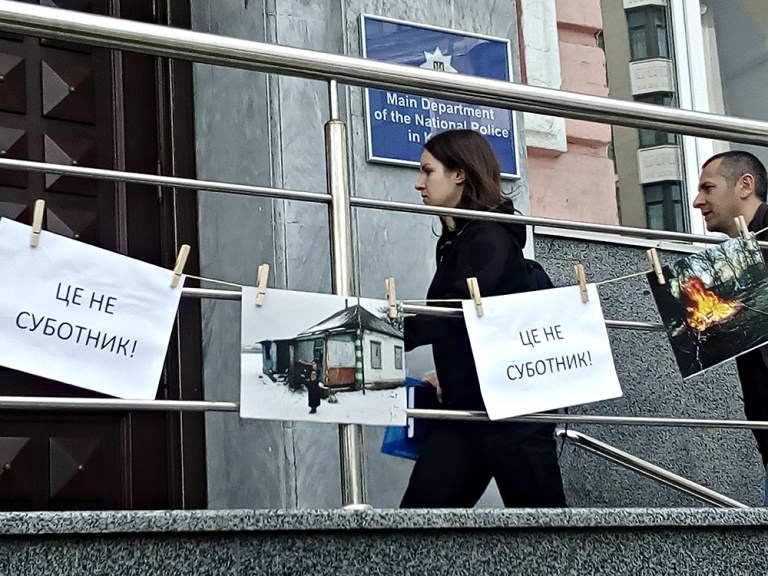 В Киеве под зданием главного областного управления Национальной полиции сегодня, 27 апреля, состоялся пикет против бездействия правоохранительных органов при поджоге ромского лагеря. Протестующие требовали расследования действий ультраправых националистов С14 и управляемой ими Муниципальной стражи.