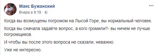 Блогер Макс Бужанский анализирует реакцию на случившееся: "Когда вы возмущены погромом на Лысой Горе, вы нормальный человек. Когда вы сначала задаете вопрос, а кого громили? – вы ничем не лучше погромщиков. И чтобы вы после этого вопроса ни сказали – не важно. Уже не интересно".