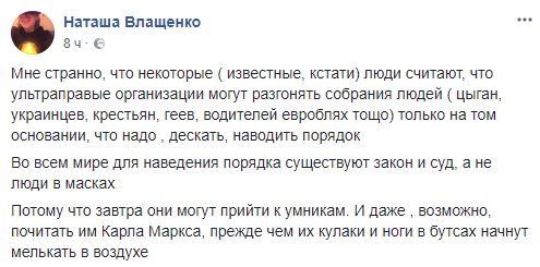 Реагируют и блогеры в Facebook. Телеведущая Наталья Влащенко высказывается о тех, кто поддержал действия радикалов: "Мне странно, что некоторые (известные, кстати) люди считают, что ультраправые организации могут разгонять собрания людей (цыган, украинцев, крестьян, геев, водителей евроблях) только на том основании, что надо, дескать, наводить порядок.