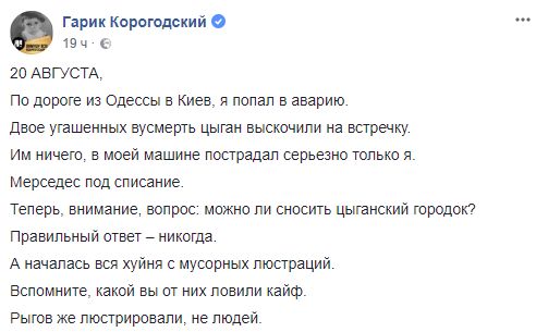 "По дороге из Одессы в Киев я попал в аварию. Двое угашенных вусмерть цыган выскочили на встречку. Им ничего, в моей машине пострадал серьезно только я. Мерседес под списание. Теперь, внимание, вопрос: можно ли сносить цыганский городок? Правильный ответ – никогда. А началась вся х**ня с мусорных люстраций. Вспомните, какой вы от них ловили кайф. Рыгов же люстрировали, не людей".
