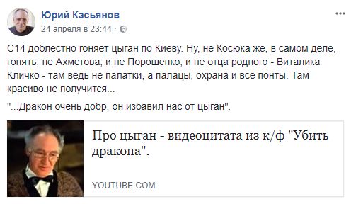 Волонтер Юрий Касьянов постит видеоцитату из фильма "Убить дракона" со своим комментарием: "С14 доблестно гоняет цыган по Киеву. Ну, не Косюка же, в самом деле, гонять, не Ахметова и не Порошенко, и не отца родного – Виталика Кличко – там ведь не палатки, а палацы, охрана и все понты. Там красиво не получится...