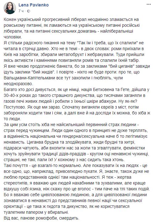 Елена Павленко: "Каждый украинский прогрессивный либерал непременно сломается на ромском вопросе. Я столько радостного гиканья на тему "Так им и надо, что их сожгли" не читала в ленте давно.
