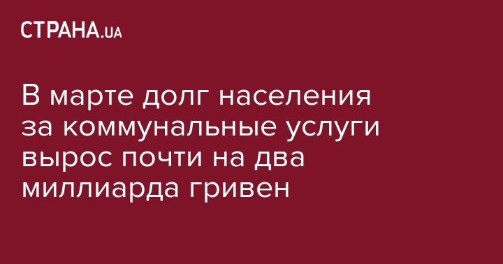 В марте суммарный долг украинцев за жилищно-коммунальные услуги увеличился на 4,9%, или на 1 795,1 млн гривен до 38 618 млн гривен по сравнению с февралем.