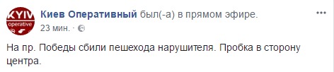 В Киеве на проспекте Победы, вечером 27 апреля, сбили пешехода, который пытался пересечь дорогу в неположенном месте. Об этом сообщает "Киев оперативный".