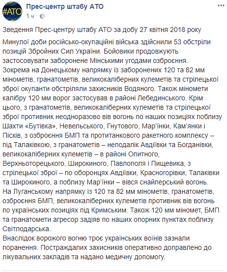В зоне проведения антитеррористической операции за минувшие сутки получили ранения трое военных. Об этом в Facebook сообщает пресс-центр штаба АТО.