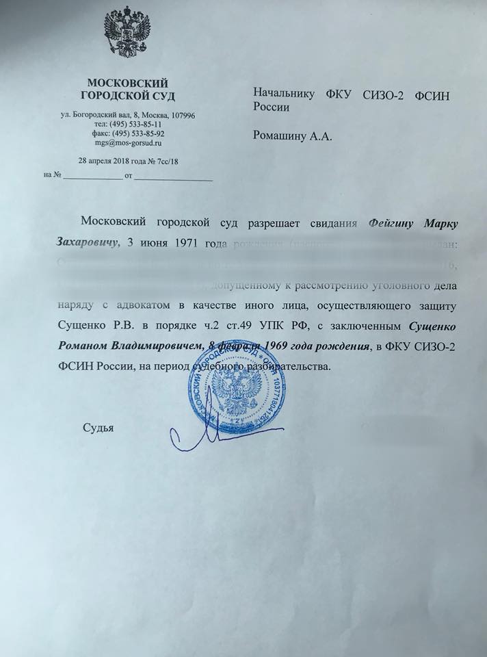 "Сущенко снова перевели из одиночки, куда он был помещен сразу после лишения меня адвокатского статуса, в камеру на двоих. Теперь у него сосед по камере. А до этого заявляли, что перевод в одиночку обусловлено интересами безопасности. Как только суд меня вернул по ст . 49 УПК, необходимость выходит отпала? Еще будет немало чудес ... ", - написал Фейгин.