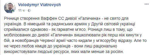 "Годовщина создания Ваффен СС дивизии "Галичина" – не праздник для украинцев. В немецкой и советской армиях во Второй мировой украинцы воспринимались одинаково – как пушечное мясо. Разница лишь в том, что мобилизованных в дивизии "Галичина" обучали год, прежде чем бросить в бой, а новобранцев Красной армии часто бросали в мясорубку сразу. Но это не из-за любви немцев к украинцам – они лишь рационально использовали человеческие ресурсы", – написал Вятрович в Facebook.