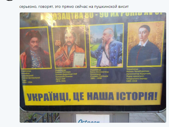Отметим, что на фото слева направо на портретах изображены Богдан Хмельницкий, Иван Мазепа, Иван Сирко, Григорий Сковорода. Вместо этого они подписаны как Иван Грушевский, Симон Петлюра, Евгений Коновалец и Номан Челебиджихан.