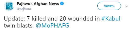 Пл некоторым данным, в Кабуле произошло два взрыва. Взрывное устройство было активировано террористом-смертником.