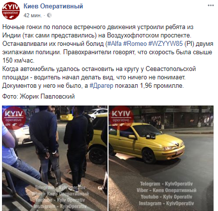 В Киеве нетрезвая компания устроила ночные гонки по полосе встречного движения, а когда их в результате погони остановили полицейские, то находящиеся в авто-нарушители люди представились гражданами Индии. События развернулись на Воздухофлотской проспекте. Об этом на своей странице в Facebook сообщает ресурс "Киев оперативный".